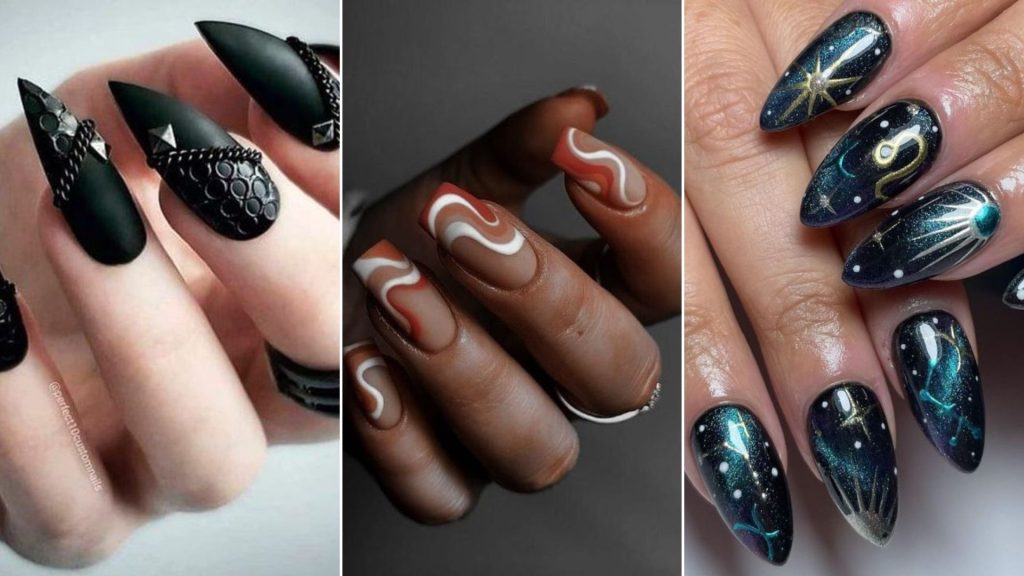 For a dark and edgy vibe, go for the gothic black matte nails. This design exudes mystery and sophistication, especially when accented with metallic elements like silver skulls or spikes. It’s perfect for making a statement at evening events.