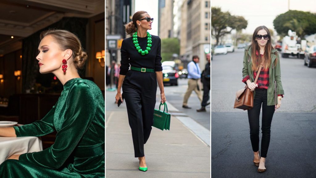 Choose a green velvet dress for an evening event, complementing it with subtle red jewelry. The richness of the velvet adds depth and sophistication.