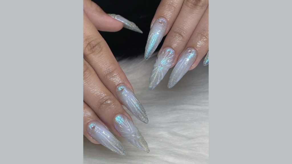 Reflect the dazzling beauty of glaciers with glacial glitter nails. A clear base drenched in blue and silver glitter allows your nails to shimmer like sunlit ice, making a bold and brilliant statement.